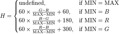 60 × ((R - G) ÷ (MAX - MIN)) +240