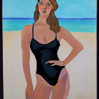 Portrait of a woman in a swimmingsuit, taken with a camera from below.
